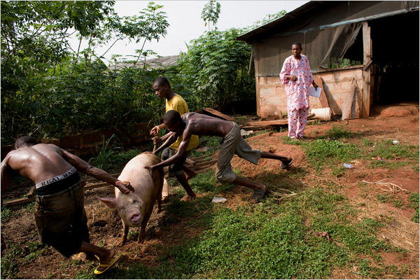 | Samuel Ighagbon watching employees at his piggery. He has