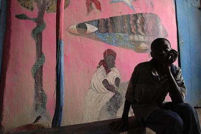 | A boy waits in front of the imagery of a voodoo temple near Saint-Marc,