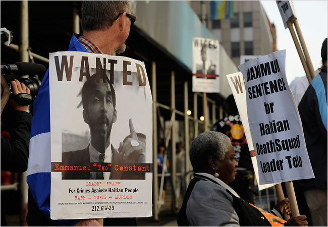 | Members of the Center of Constitutional Rights organized a rally in front of the State Supreme Court in Brooklyn for the trial of Emmanuel Constant on Tuesday. (Photo Robert Stolarik for The New Times) |