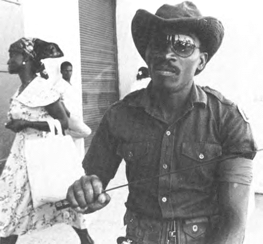 Tonton Macoute or militia man brandishes his machete in an attempt to kill more Haitians for